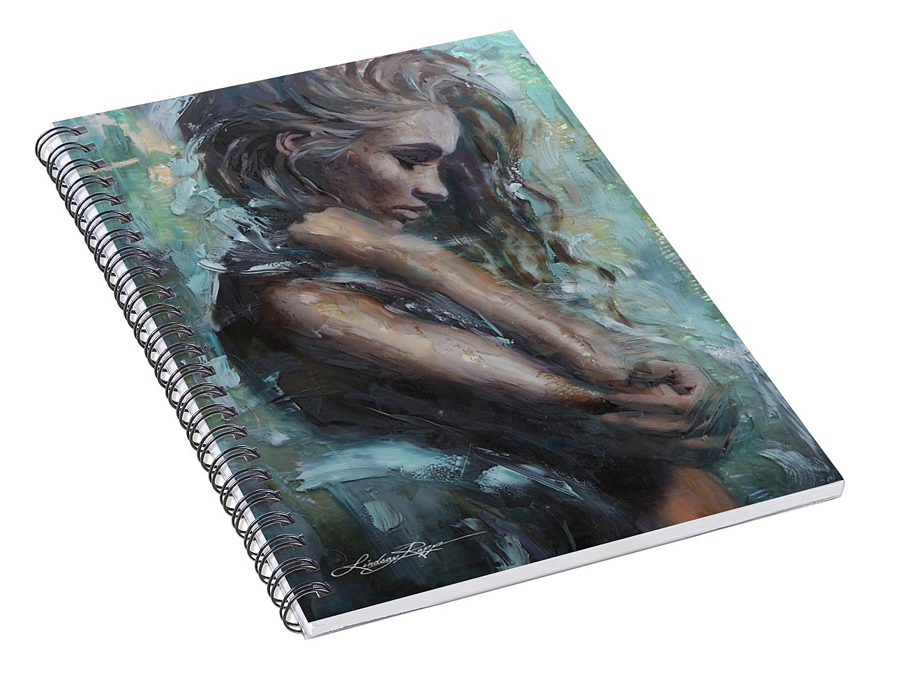 Our spiral notebooks are 6" x 8" in size and include 120 pages which are lined on both sides. The artwork is printed on the front cover which is made of thick paper stock, and the back cover is medium gray in color. The inside of the back cover includes a pocket for storing extra paper and pens.