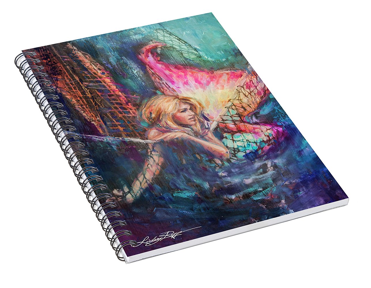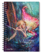 Our spiral notebooks are 6" x 8" in size and include 120 pages which are lined on both sides. The artwork is printed on the front cover which is made of thick paper stock, and the back cover is medium gray in color. The inside of the back cover includes a pocket for storing extra paper and pens.