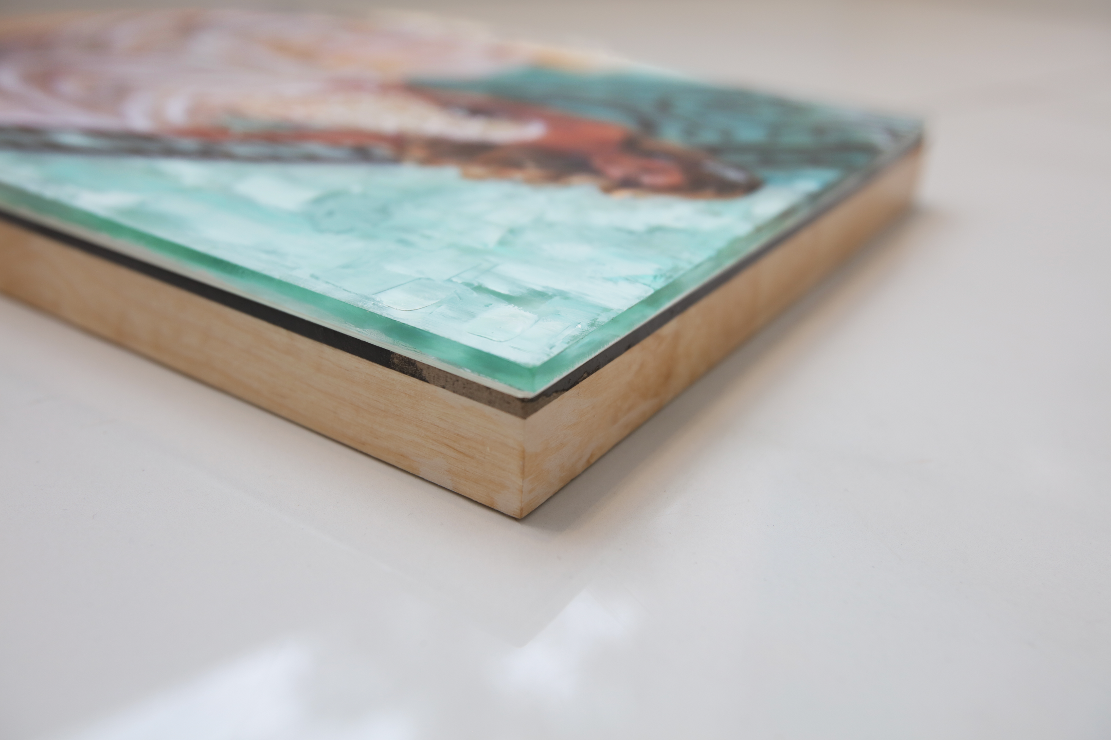 • mixed media including genuine iridescent shell on plexiglass mounted on wood