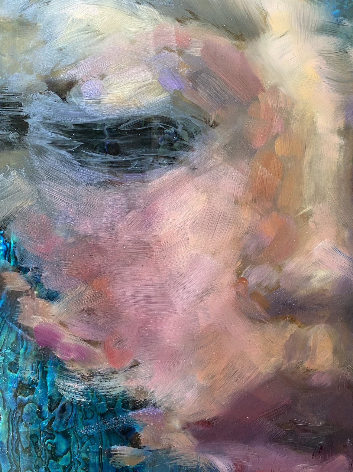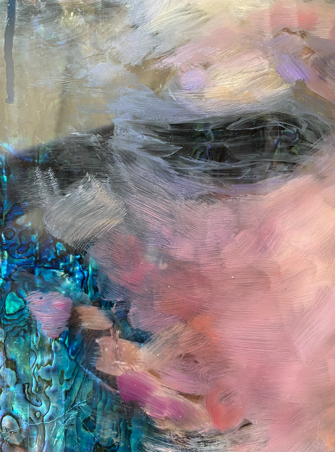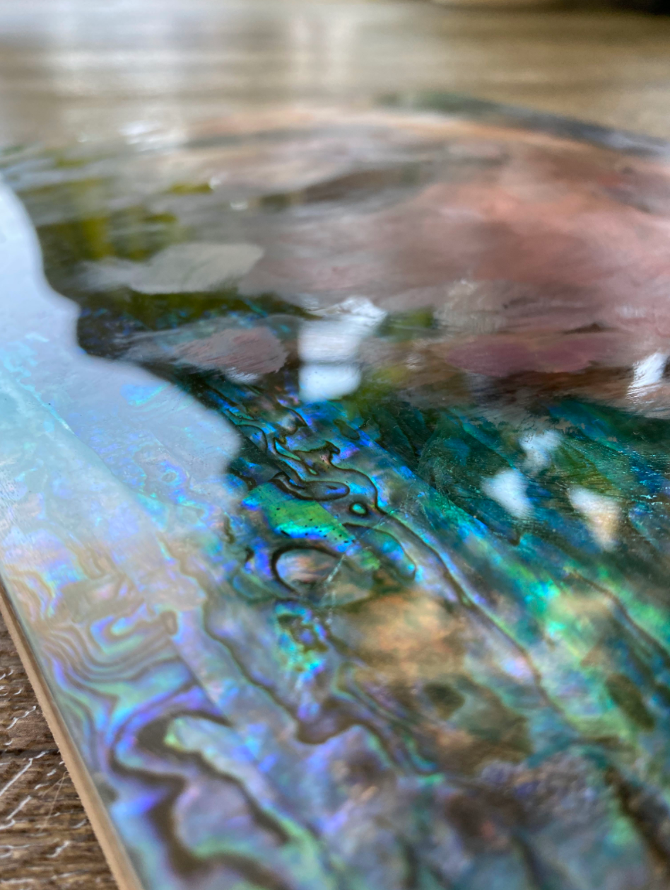 mixed media including genuine iridescent shell on plexiglass mounted on wood8" x 10"