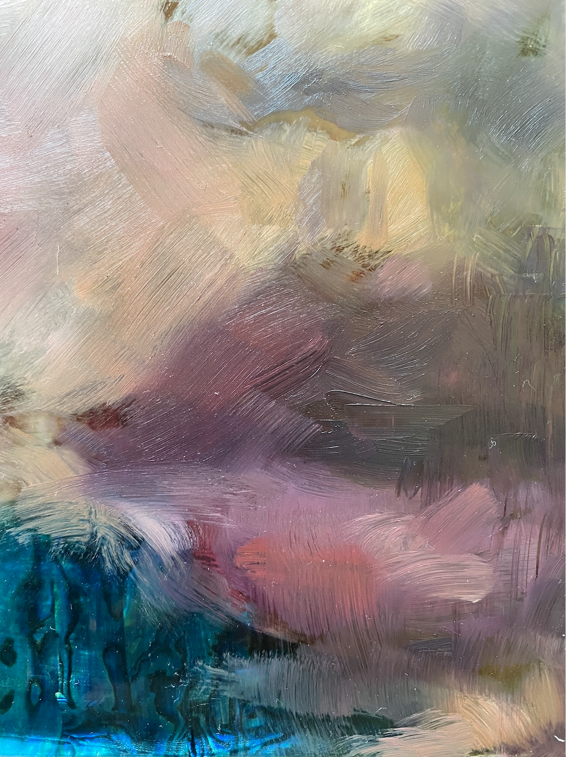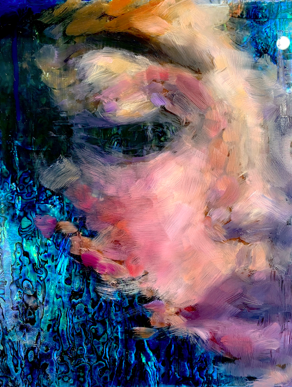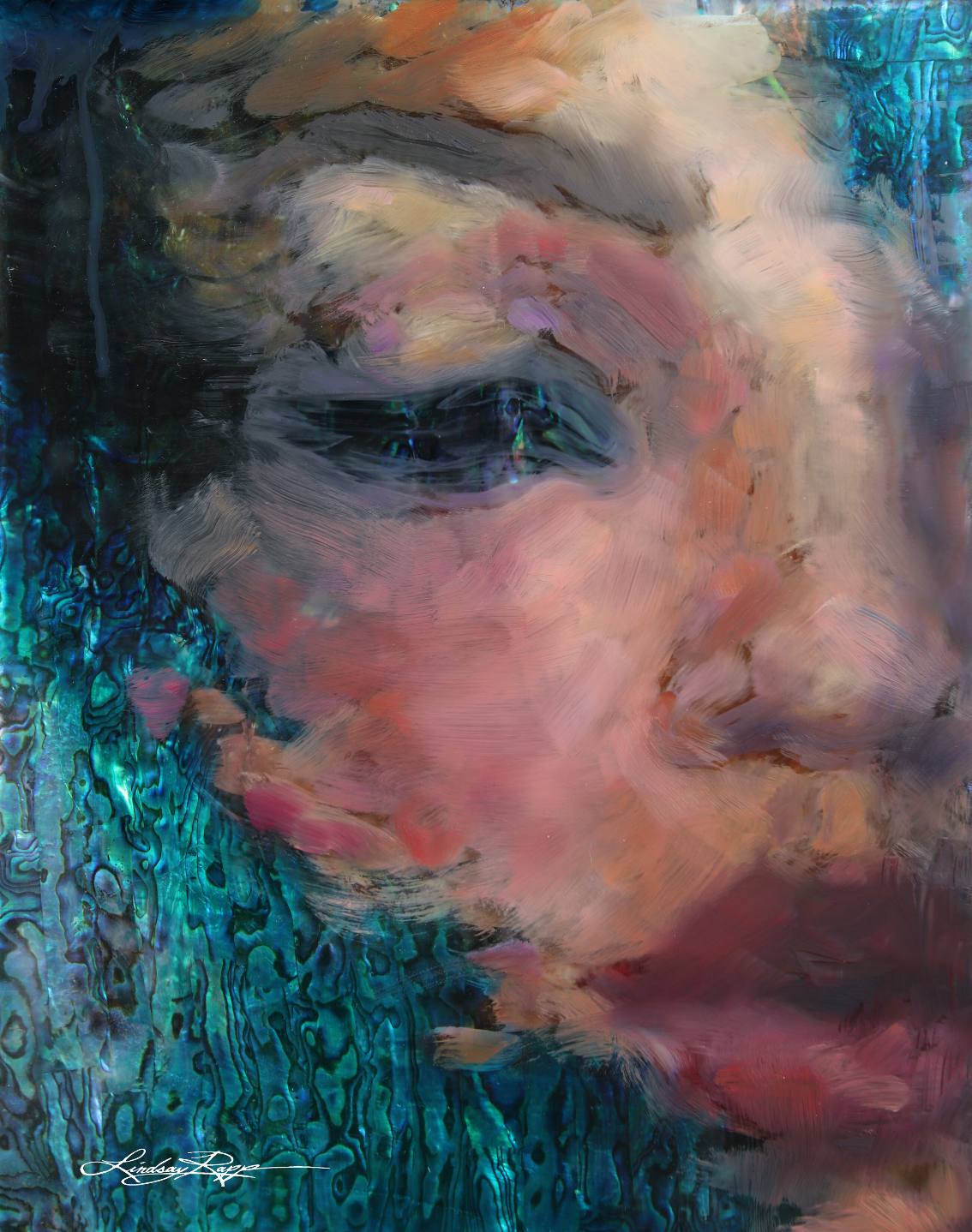mixed media including genuine iridescent shell on plexiglass mounted on wood8" x 10"